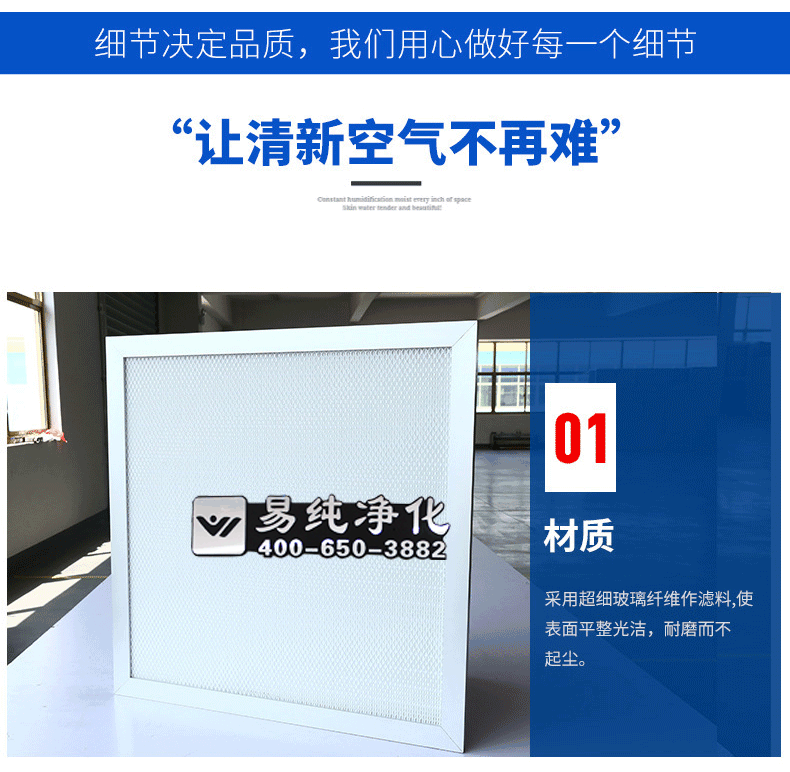 濾料:多采用玻璃纖維,化纖類逐漸在使用,目前國外有些廠家采用帶靜電的聚四氟乙烯纖維(駐極體)制造高效過濾器、 俗稱PTFE。