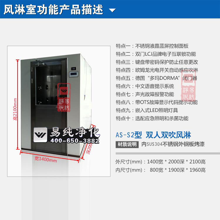 風(fēng)淋區(qū)尺寸800W*1900D*1960H風(fēng)淋時(shí)間范圍0-99S電源380(V)