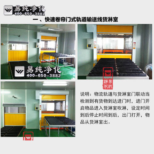4、快速卷簾門流水線貨淋室(自動(dòng)感應(yīng)控制快速卷簾門),流水線可做成整體一條線,門下降時(shí)接近流水線,也可將流水線分成三部分;