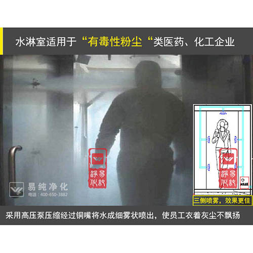 1.2介紹:人員進(jìn)入水淋室,水淋室自動(dòng)感應(yīng)噴淋水霧,潤濕工作服上粘附的粉塵,避免脫衣過程引起物料飛揚(yáng)對人員和環(huán)境的影響。