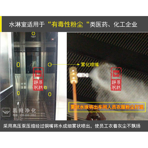 噴淋室內(nèi)的霧化裝置會(huì)形成低紊流的濕霧,能把污染工作服的原料藥粉塵微顆粒包覆,不斷凝聚成大的物料顆粒。