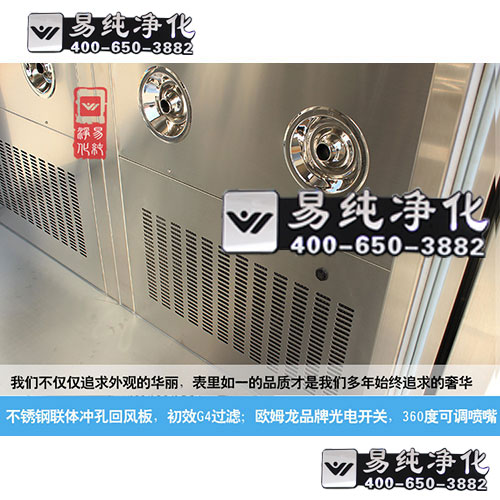 說明:風(fēng)淋室表面采用304拉絲不銹鋼制作,表面經(jīng)過抗指紋處理,普通的不銹鋼用手一摸會(huì)生出很多手印。易純公司不銹鋼風(fēng)淋室表面均經(jīng)過處理,可以讓你常用常潔,表面光亮如新。