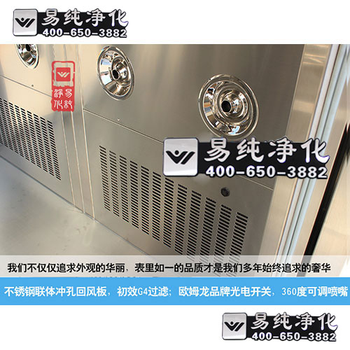 說明:風淋室表面采用304拉絲不銹鋼制作,表面經(jīng)過抗指紋處理,普通的不銹鋼用手一摸會生出很多手印。易純公司不銹鋼風淋室表面均經(jīng)過處理,可以讓你常用常潔,表面光亮如新。